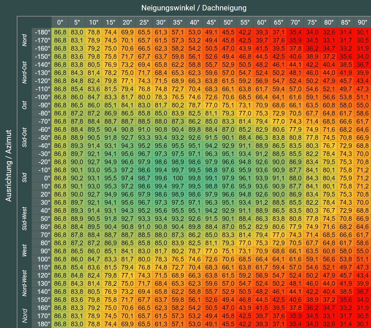 Wie berechnen Sie den PV-Ertrag mithilfe der Winkel-Tabelle?